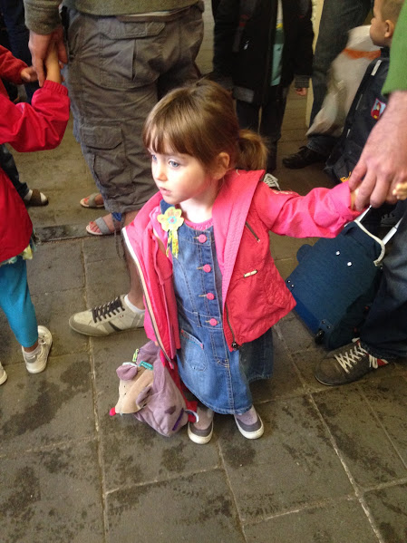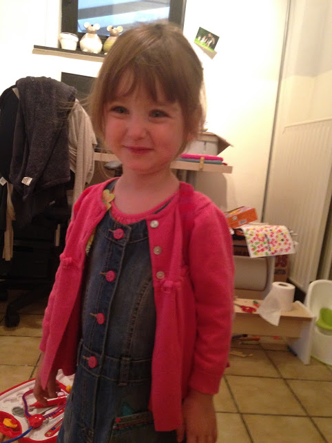 Réveil un peu difficile ce matin (bah oui, la Poupette est une grasse-mat-addict, pour notre plus grand bonheur), mais grand sourire quand on lui a rappelé où elle allait aujourd’hui.