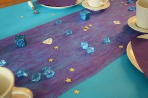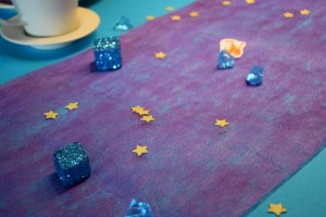 Qu’à cela ne tienne, re-tableau Pinterest pour l’inspiration… et finalement les idées se dessinent assez vite. Les mille et une nuits, Aladdin, Jasmine… on est dans les couleurs turquoise, violet et or ! C’est sur le site Vegaooparty, dans la partie destinée à la décoration des anniversaires , que je trouve mon bonheur (nappe, pompons, décoration de table, serviettes, ballons…).