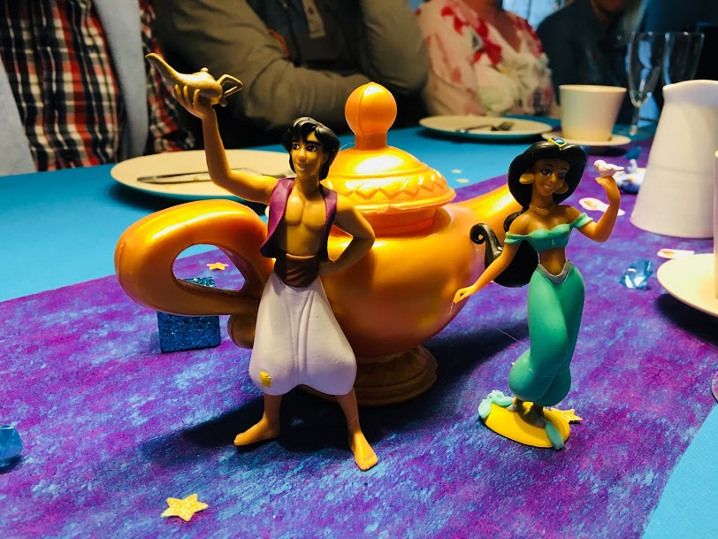 Nous voilà donc à bloquer la date 3 mois à l’avance, pour être sûrs que toute la famille pourrait être présente ! Et très vite, ma presque 6 ans me demande un anniversaire de licornes. Là, je dis « bingo », easy game, les licornes ! Il y a tellement de décoration disponible ! Je me lance dans un tableau Pinterest, rêve de gâteau arc-en-ciel et de serviettes licornes… quand un jour, boum patatras ! Elle m’annonce qu’elle ne veut plus de licornes, mais un anniversaire Aladdin et Jasmine ! Elle a vu le dessin animé cet été, et on lui a lu l’histoire à de nombreuses reprises… Ceci explique cela ! Et puis, Jasmine est une princesse qui fait rêver, et que j’aime aussi beaucoup finalement, notamment pour son côté indépendant. « Aladdin » est d’ailleurs un de mes Disney préférés.