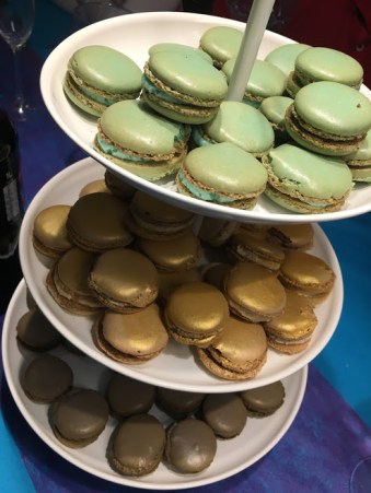 Mais vous me connaissez, j’adore la pâtisserie et j’aime aussi apporter ma petite touche à l’anniversaire de mes filles, mon petit grain de sel (ou de sucre) :-). Comme j’avais très envie d’essayer de faire des macarons, j’ai décidé de les faire dans les 3 couleurs du thème. C’était sans compter la mauvaise qualité de mes colorants (les colorants Scrapcooking, plus jamais), qui ont pâli à la cuisson. Mais sur l’aspect et le goût, j’étais plutôt contente du résultat (les dorés étaient au spéculoos, les turquoises à l’arôme de fraise et les « violets » à l’arôme de violette).