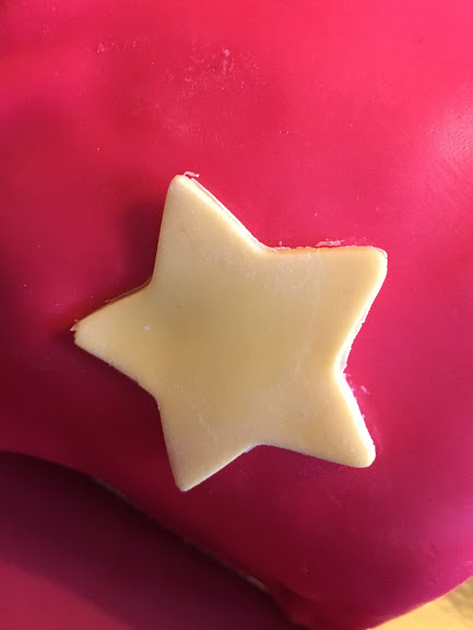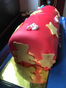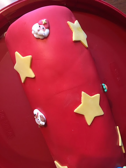 J’ai eu besoin de pâte à sucre rouge pour recouvrir le gâteau, jaune pour les étoiles et brune pour les nounours. Enfin, les petits décors en sucre thème Saint-Nicolas ont été achetés tout faits.