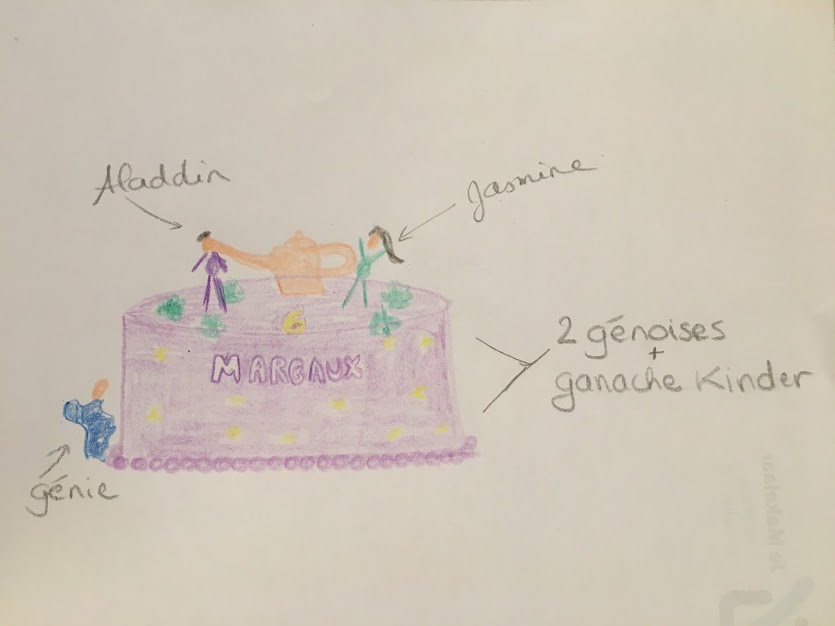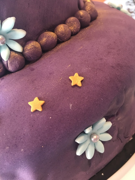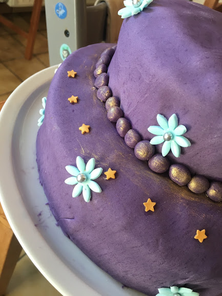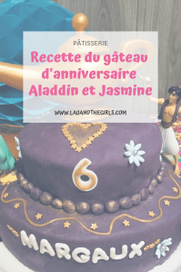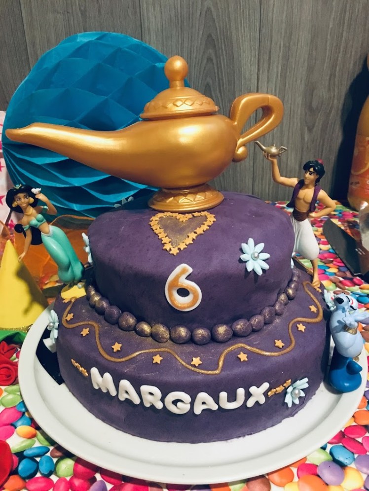 En ce qui concerne la décoration, tout est permis, évidemment ! Comme la Prem’s est dans sa période Aladdin et Jasmine, j’avais choisi une pâte à sucre violette, avec des détails dorés. J’ai placé les figurines du film et la lampe tout au-dessus du gâteau. Quelques fleurs découpées à l’emporte-pièce, quelques étoiles, le prénom, l’âge… et voilà le résultat !