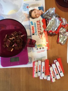 - Faire fondre les Kinder Maxi (bain-marie ou micro-ondes, au choix). Ils fondent plus vite si vous les coupez en morceaux.