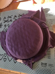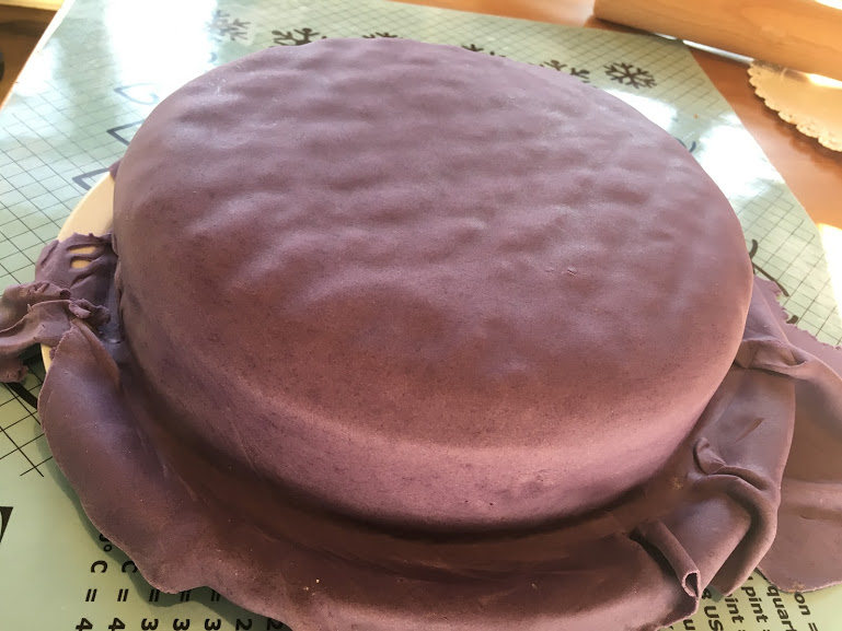 Ensuite, j’ai fait pour la première fois un croquis du gâteau tel que je l’imaginais (mode « Le meilleur pâtissier » activé). Pour moi, la pâte à sucre qui l’enrobait devait être mauve ou turquoise, avec des éléments de décoration dans les tons dorés. J’ai finalement choisi le mauve, car je trouvais que les éléments dorés y ressortaient mieux.