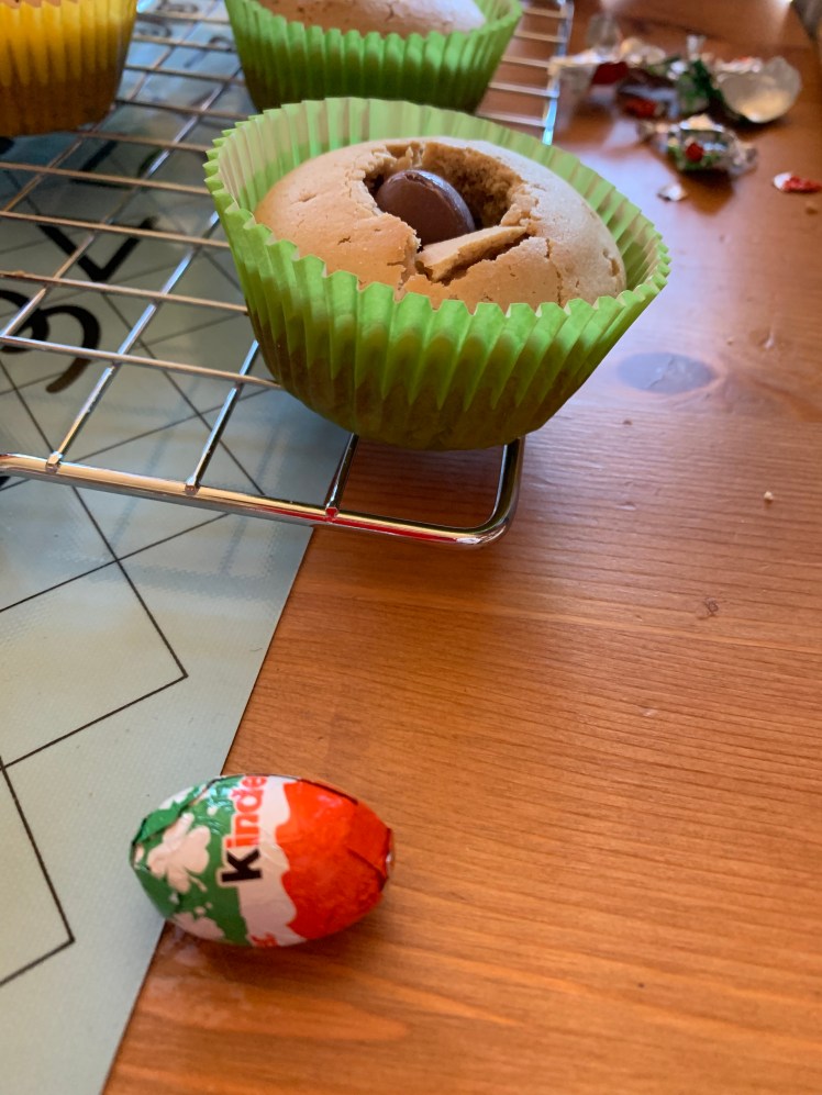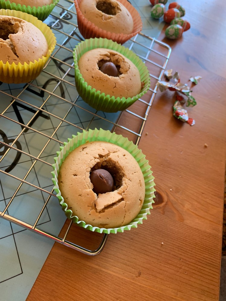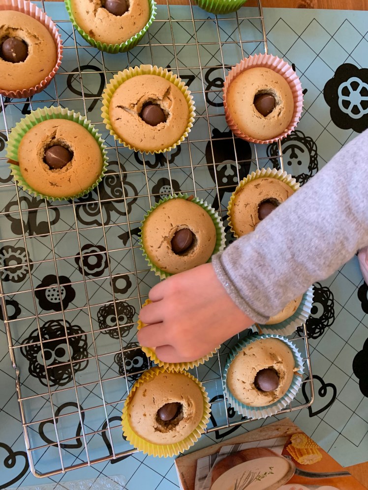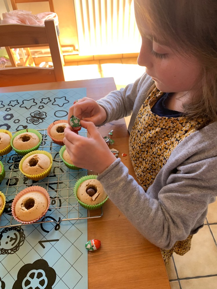Le petit plus : dès qu’ils sont refroidis, je les creuse pour y fourrer un goût ! Cela peut aller de la pâte à tartiner au chocolat à la confiture, en passant par une pâte speculoos par exemple. Cette fois et vu le thème, nous avons glissé un oeuf en chocolat dans chaque cupcake ! C’est la petite surprise de la dégustation 🙂