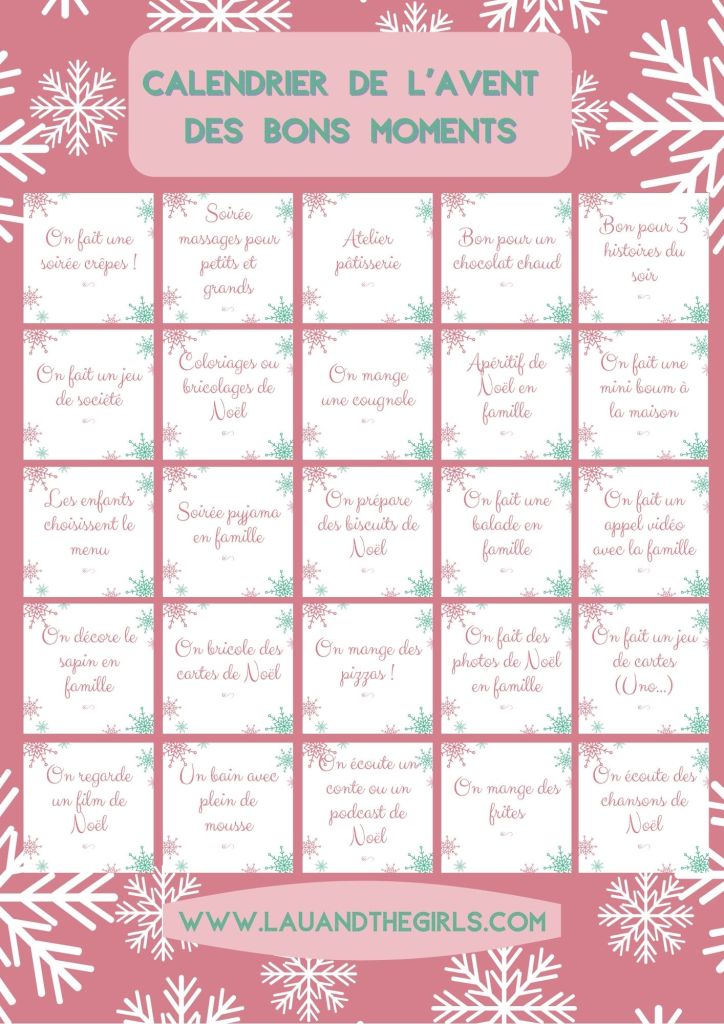Cette année est très particulière, le mois de décembre le sera aussi. Anxiogène, compliqué, incertain. Pas de marché de Noël, pas de rencontre avec Saint-Nicolas, pas de sorties avec les copains, pas ou peu de moments en famille élargie… 😦 Mon cher calendrier des bons moments en famille allait être plus compliqué à créer et à remplir. Mais j’ai cherché, j’ai creusé, et j’ai trouvé 25 activités « spéciales confinement / coronavirus ‘proof » » à faire en famille. Nous aurons donc notre calendrier de famille, comme l’an dernier. ❤ Vous cherchez des idées de bons moments ? N’hésitez pas à télécharger mes petits « bons » à imprimer et à découper ici :